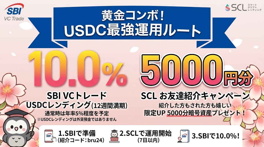 本記事で紹介しているSCL(スマートクリプトレンディング)やSBI VCトレードのサービスは、将来の利益を保証するものではありません。暗号資産の運用には、価格変動リスクやプラットフォームの破綻リスク等が伴います。