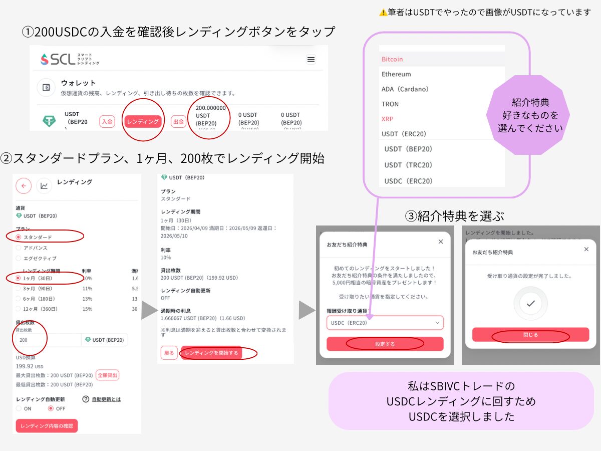 SCLではBTCやETHも運用できるけれど、今回の少額(200枚〜)キャンペーンの対象はUSDT/USDCのみ。価格変動を抑えて手堅く始めたい初心者さんには、この2つの通貨(ステーブルコイン)が特におすすめです。